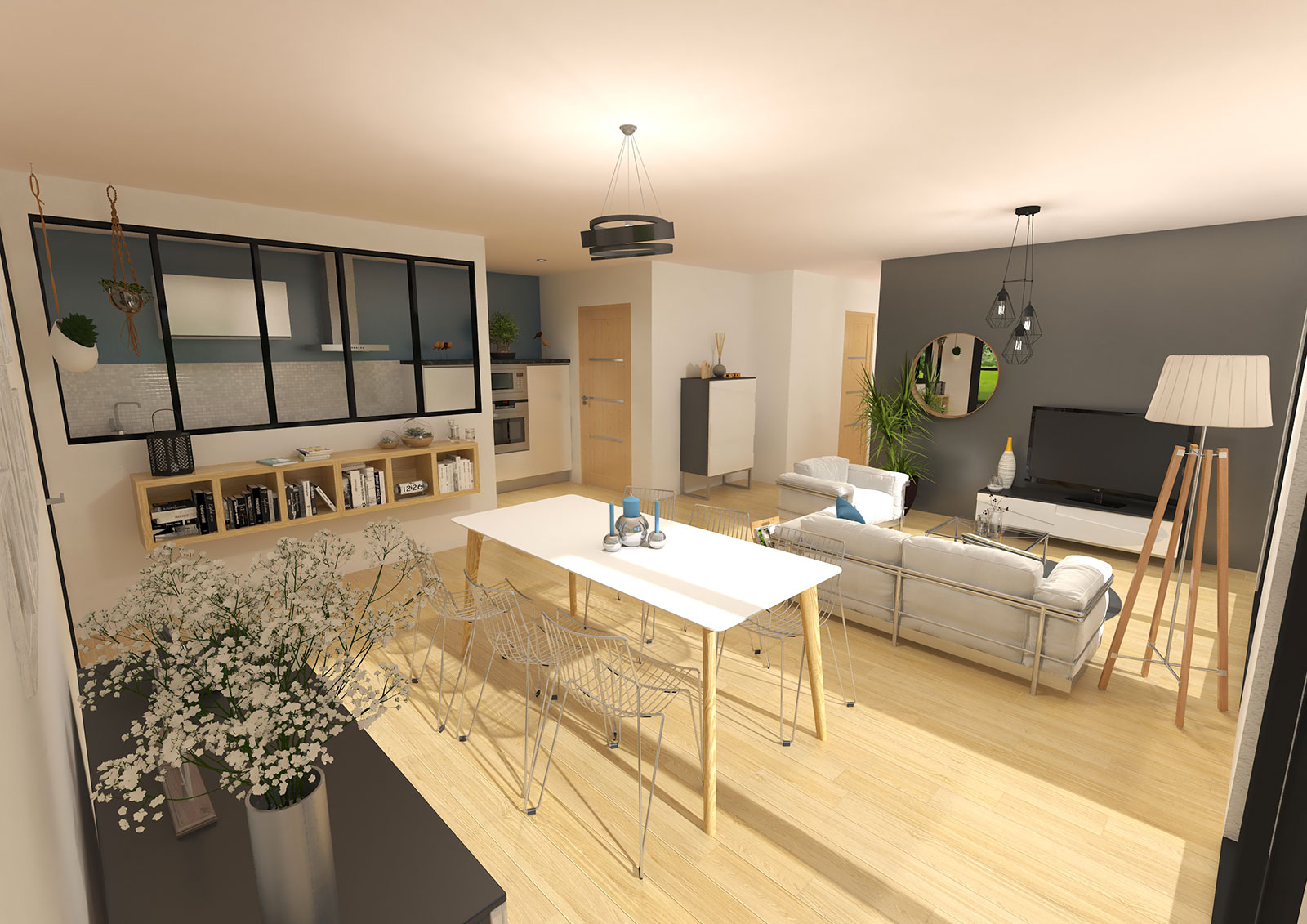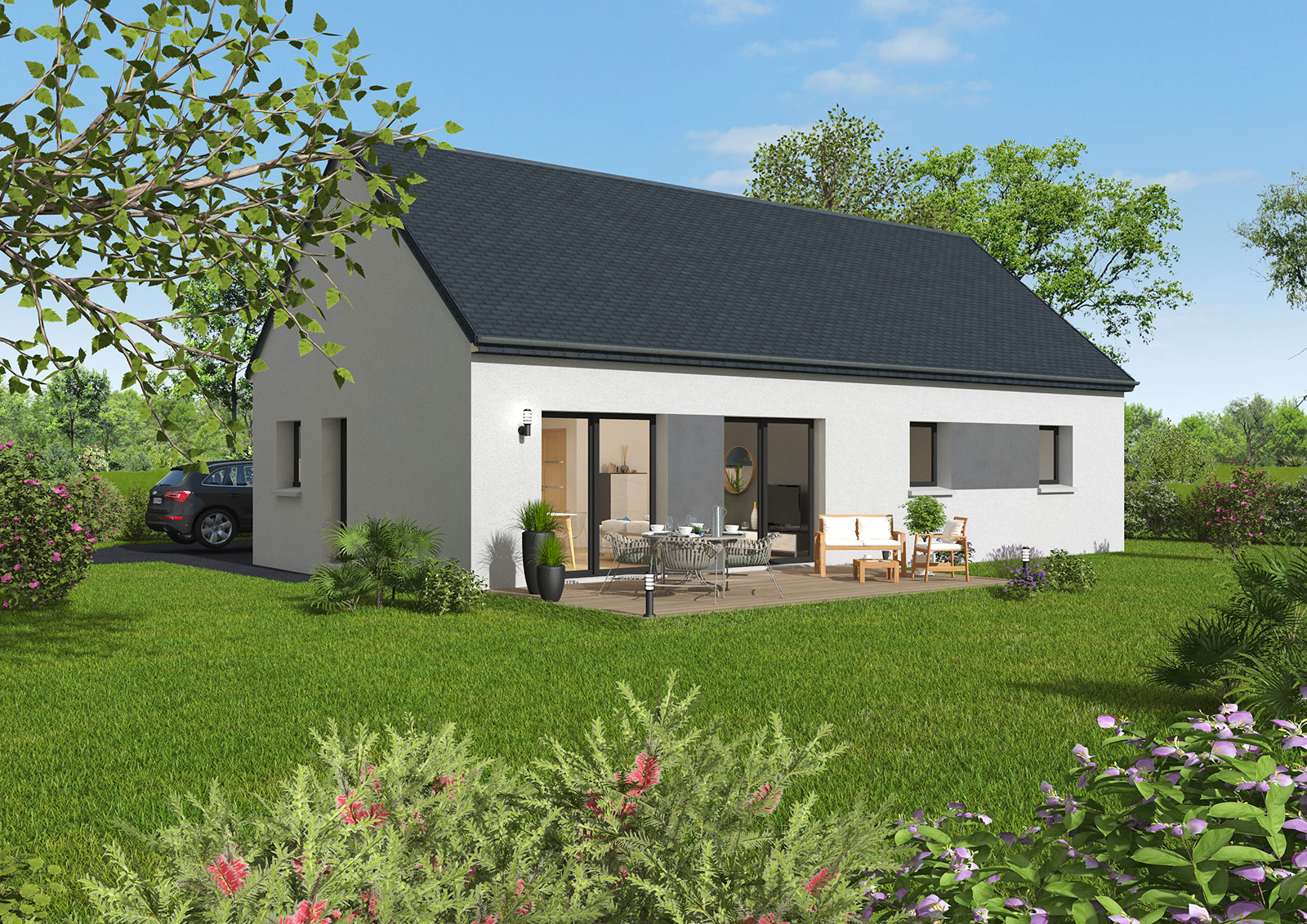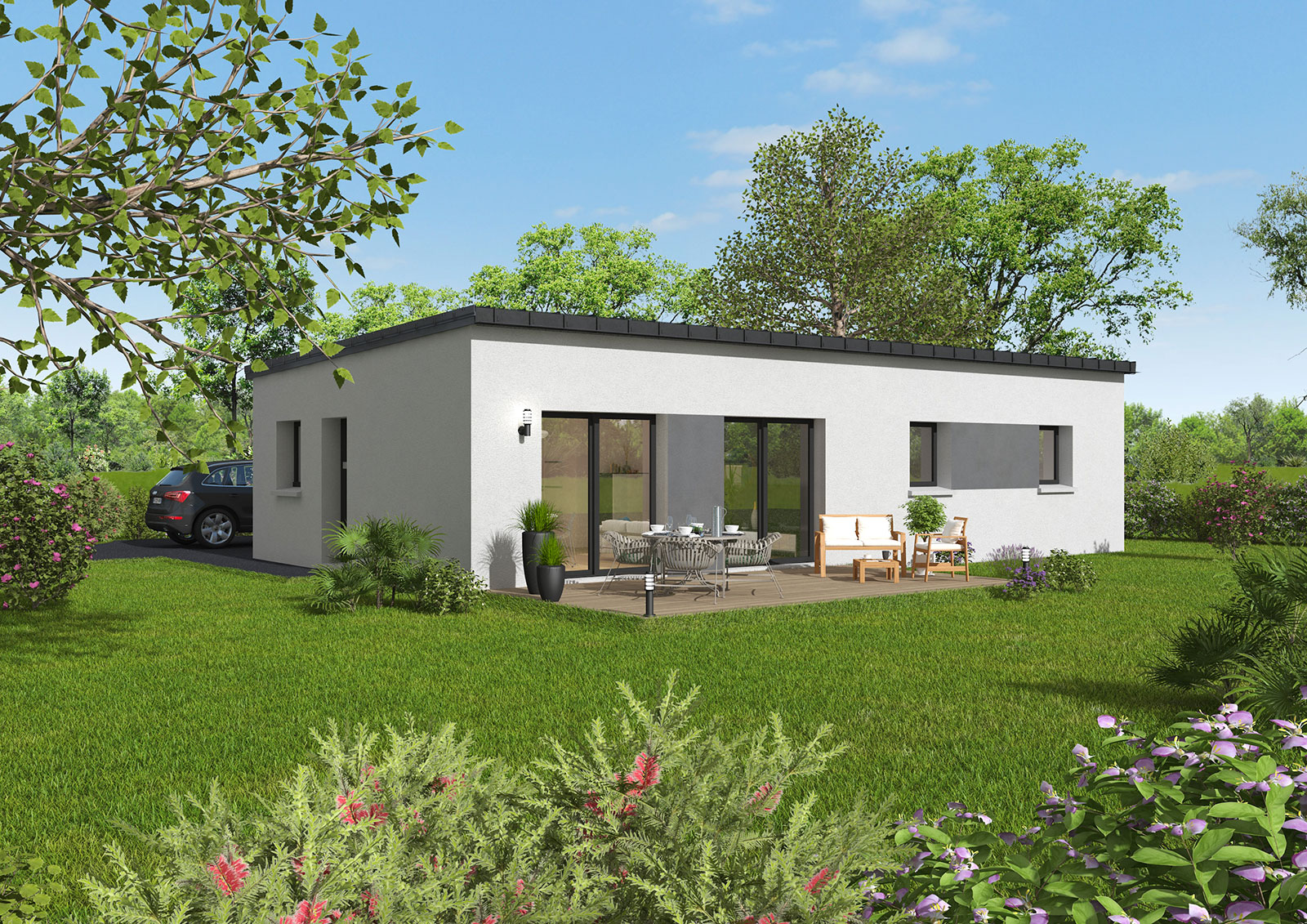 La maison de plain-pied « Even-Hom » est un modèle qui existe en toit plat et en ardoise 2 pentes. Son aménagement vous permettra de circuler naturellement dans toutes les pièces. Elle se compose d’une belle pièce de vie ouverte et lumineuse avec un coin salon et un coin cuisine/repas, une buanderie, mais également un coin nuit pouvant accueillir 2 ou 3 chambres, un sanitaire et une salle de bain. Cette fluidité d’aménagements est l’atout majeur de cette maison !